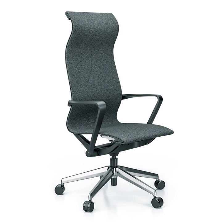 A cadeira Giratória Multitask Aura com revestimento em tecido e base em alumínio polido combina design contemporâneo e precisão ergonômica.