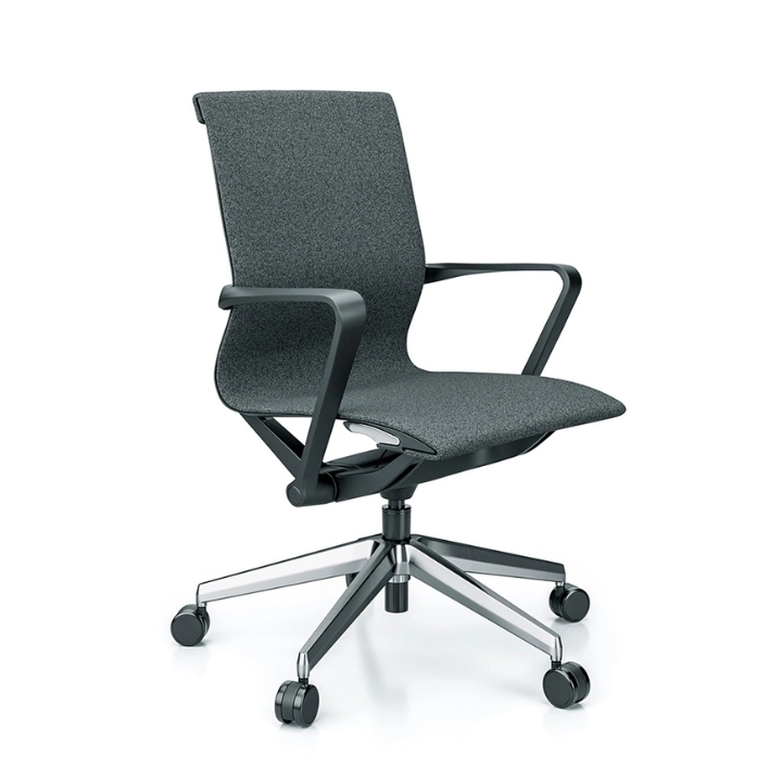 A Giratória Multitask Aura, com base em alumínio polido e acabamento em tecido, destaca-se pela sofisticação e conforto prolongado.