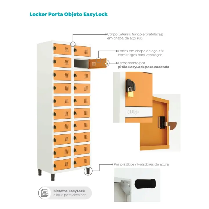 CARACTERÍSTICAS: Fabricado em chapa de aço 26, porta com fechamento através de pitão Easylock para cadeado.