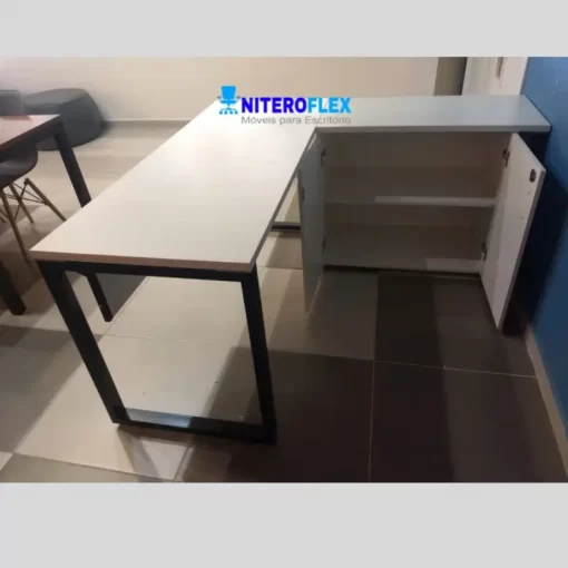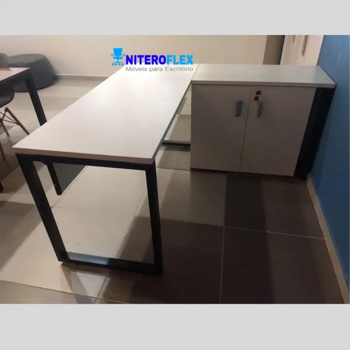 - Armário Acoplado: O armário abaixo da mesa lateral auxiliar oferece espaço de armazenamento adicional para manter o ambiente de trabalho organizado.